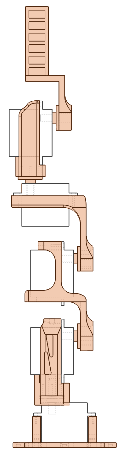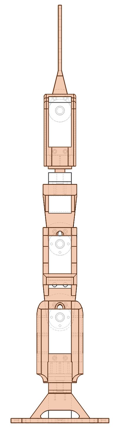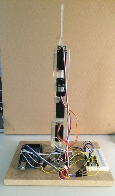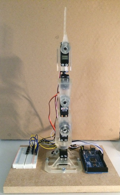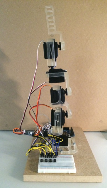 It uses one servomotor for each degree of freedom, all controlled and powered by the Arduino Mega 2560.