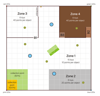 The goal of this competition is to create an autonomous robot able to gather Duplo toys and drop them in the collection zone of the 8x8 meters arena that features obstacles and different terrains. The room have four different regions with different color LEDs in every corner. The robot have 10 minutes inside the room to collect as many Duplo as it can.